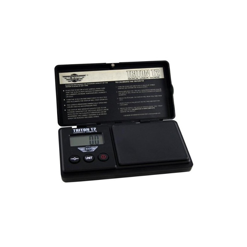 MyWeigh Triton T2 with 120g Capacity The MyWeigh Triton T2 has a weight capacity of 120 grams and is precise up to 0.1 grams. The Triton T2 is a well known and well respected pocket scale. It's large hinged covers can be used as an expansion tray and comes with an integrated ribbed poly-case. This backlit digital scale has a 5PPS5 point overload Protection System and is secured by a 30 year warranty. This scale runs on AAA batteries. Weighing made easy! Click to View Scale Manual