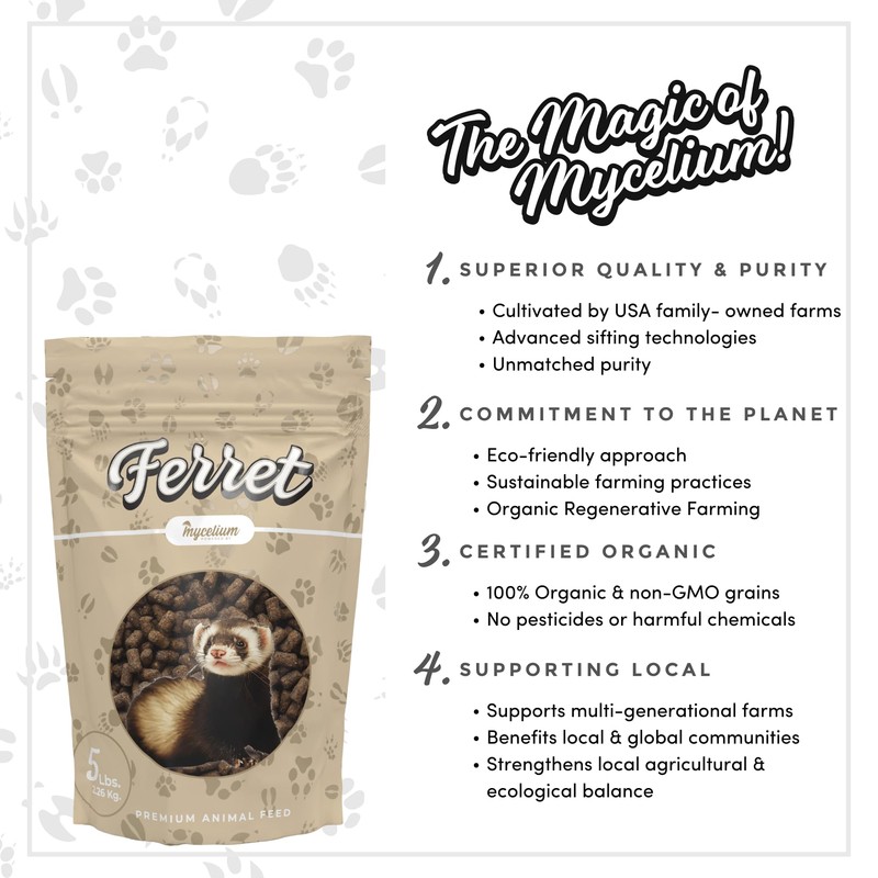 Mycelium Premium Ferret Feed – Organic, Non-GMO, High Nutritional Value Food for Ferrets, Sourced from Local USA Farms, Sustainable Farming, 5 lbs