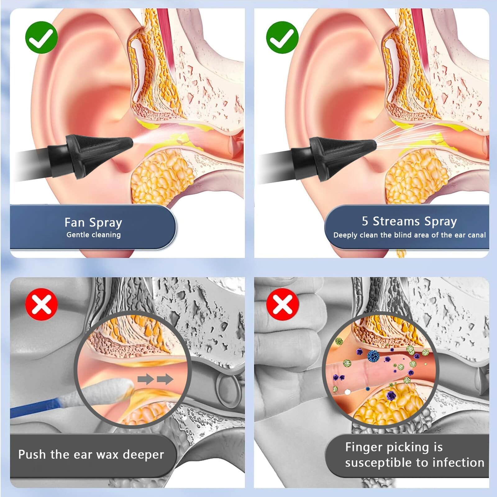 - 【4 Pressure Options and 2 Kinds of Spray Nozzles】: Choose the perfect pressure for your needs with 4 pressure options to get a gentle clean to ear wax removal. The 2 kinds of nozzles form a 5 streams spray and a fan spray to deeply clean the blind area of the ear canal for effective cleaning.