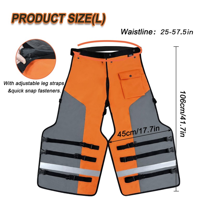 - Note: Please check the size before purchase to see if it fits your size. Premium Material:The outer fabric of the chainsaw chaps is composed of durable oxford polyester.The durable chainsaw protective chaps perfectly suitable for forestry work