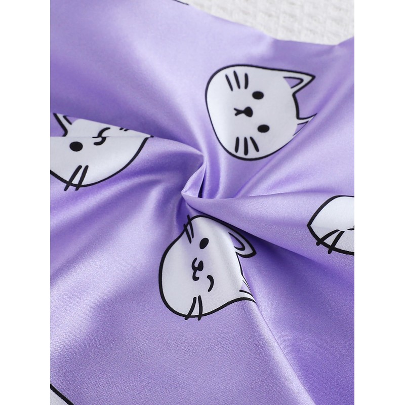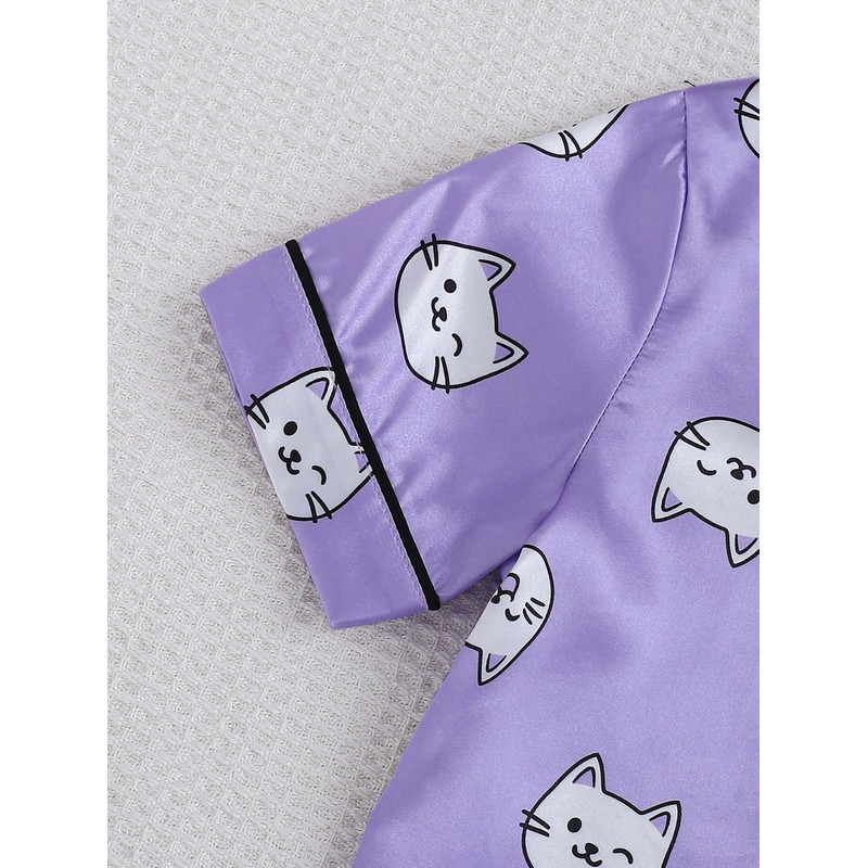 MyFav Girls Pajama Set Short Sleeve Button Down Silky Satin Girls PJS Kids Sleepwear Summer Nightwear Loungewear Set,Purple Cat,8Y