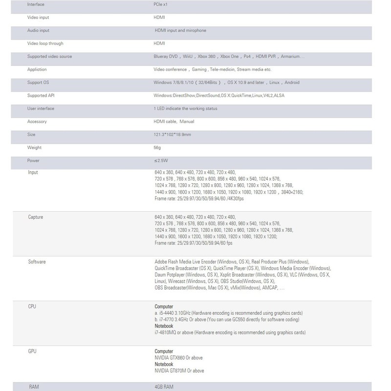Descriptions: Capture card is 1080P60 with PCIe x1 interface. It supports UVC and no need to install driver any more comparing with other captures software. Moreover, it can be compatible with most third party software Skype,Facebook Live、YouTube Live、LiveStream、UStream、Dacast、Wowza Cloud.