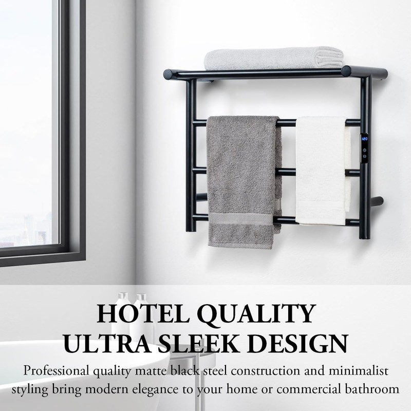 - Wall mounted ultra-modern hotel series heated bathroom rack for hanging hot towels with a top shelf and a sleek LED control panel for adjusting the timer and temperature **Electrical outlet plug-in required**