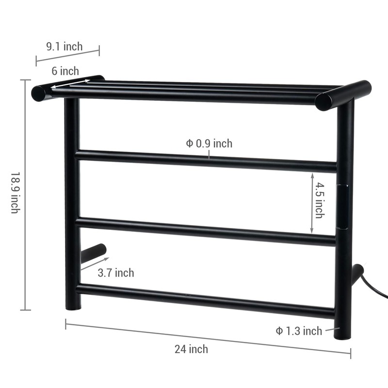 - Electric bath towel warmer features a high-quality stainless-steel construct in a deluxe matte black powder-coat finish for a contemporary minimalist chic aesthetic