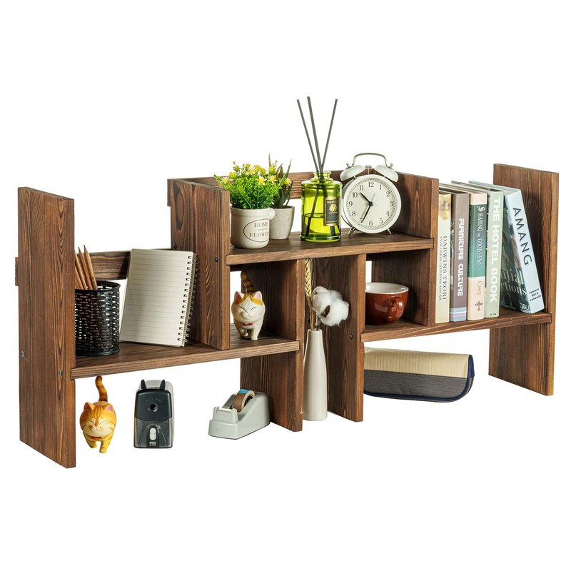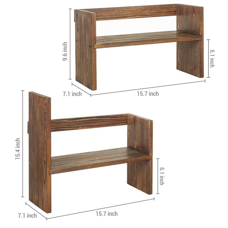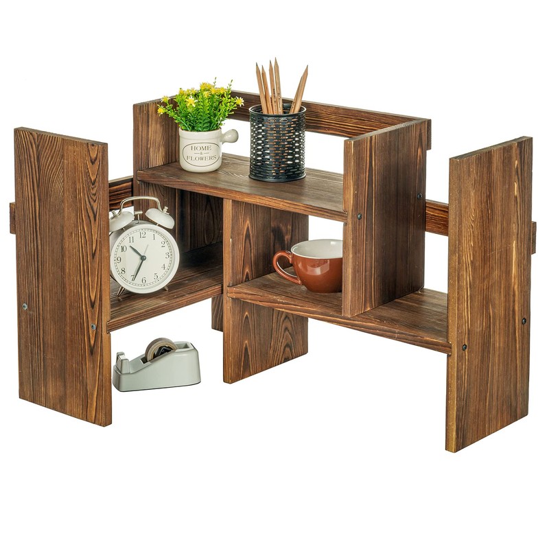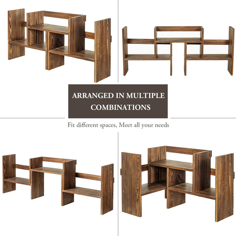 MyGift Adjustable Desktop Shelf, Deluxe Rustic Burnt Solid Wood Stackable Multilevel Bookshelf Organizer Stand, Home or Office Desk Storage Shelving Rack