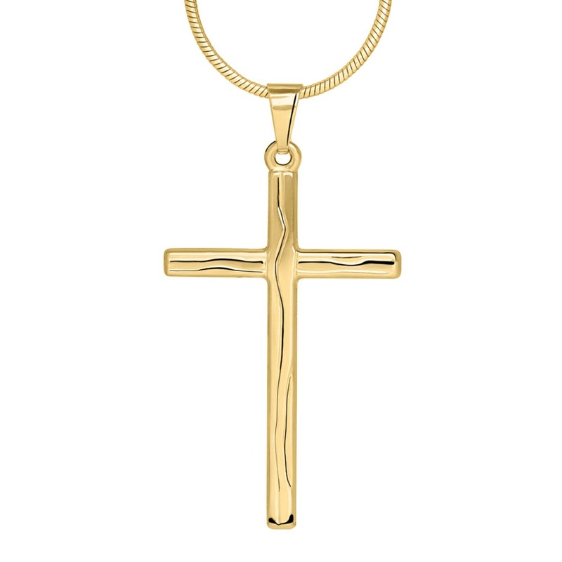 Pair with fine to medium strength necklaces. These can be easily threaded. Whether it is a curb chain, a Figaro chain or an anchor chain. All designs skilfully adapt to this classic cross pendant. It is very original in its design, but still looks restrained in combination with a golden necklace.