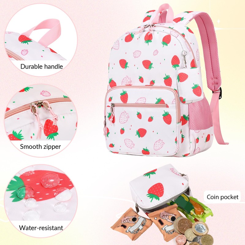 Enough pockets to storage things organized and handy, large capacity meets all your child's daily needs. 1 roomy main double zippered pocket with an inner pouch can safely store and organize your child's books, notebooks, toys, clothes, folders, umbrella, and so on. 1 front pocket can hold things such as snacks,lunch, or school supplies. two side pockets for water and mikeaccommodate different size of water or milk bottle, umbrella and some small items.