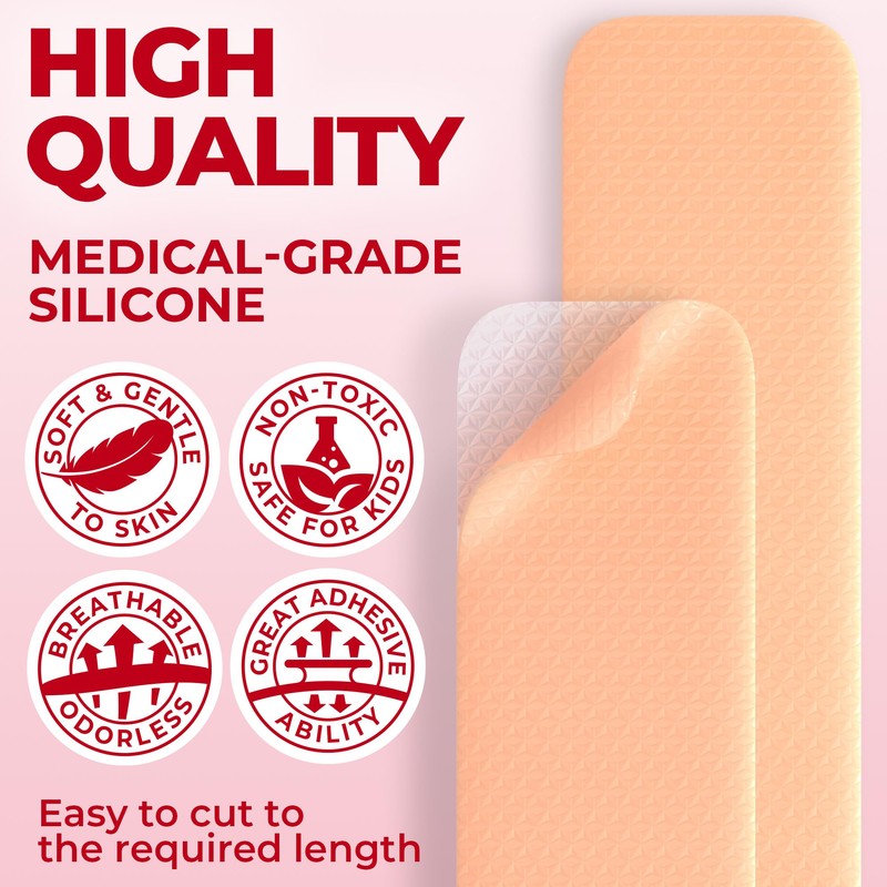 - GREAT ADHESION — With superior adhesive properties, our strips can be used as silicone scar sheets for face, post-surgical, tummy tuck, and keloid scars. This ensures consistent and effective treatment, helping your scars heal more efficiently. They’ll stay securely in place, even on challenging areas like the knees or elbows.