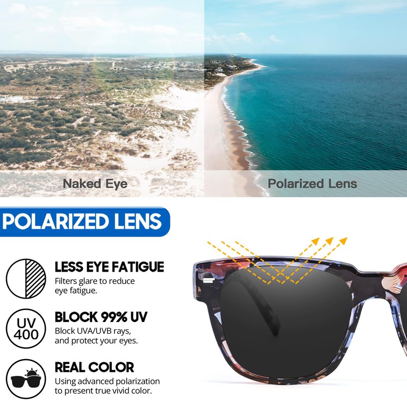- VERSATILE USE: You can use our women's sunglasses in most outdoor activities such as driving, hiking, boating, biking, fishing, etc. to protect your eyes from the harsh sunlight, and no longer have to worry about driving reflections or not being able to see the lake surface in the glittering water in your daily amusement.