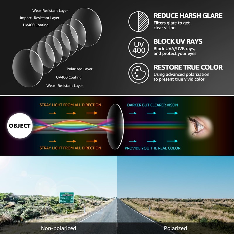 - CLEAR AND COMFORTABLE VISION: In order to provide better visual comfort for the eyes, this pair of sunglasses reduces glare reflected by bright roads or water surfaces, making everything look clearer and relieving eye fatigue. It is very suitable for driving, outdoor activities.