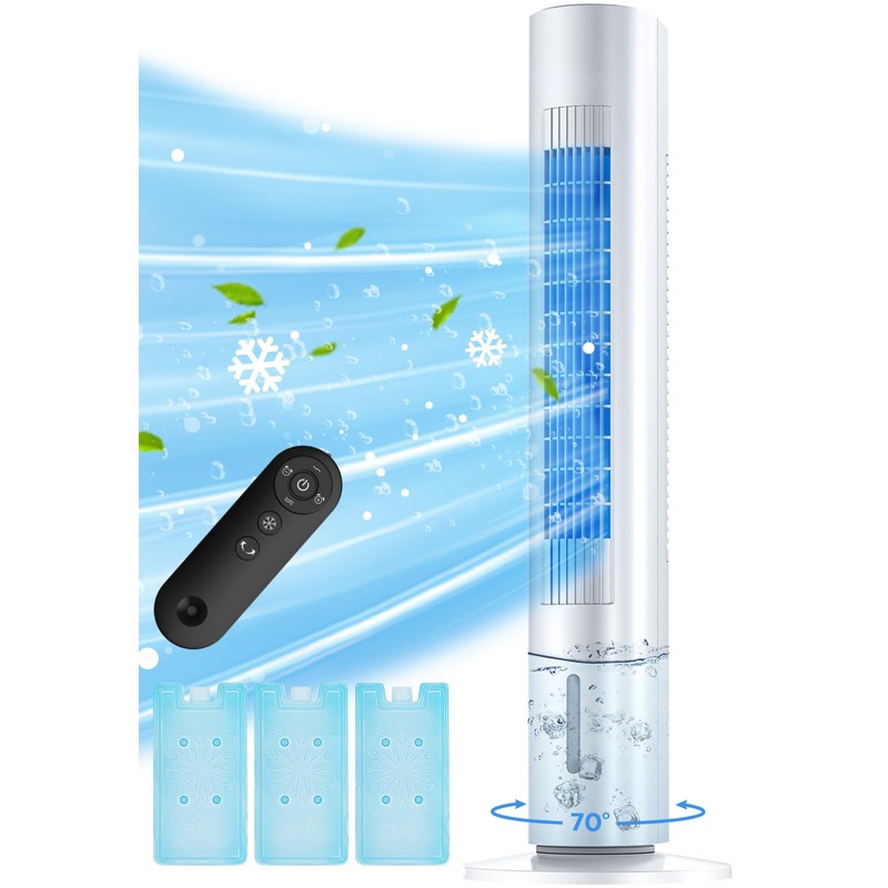 MYICY Evaporative Air Cooler, 35" Windowless Air Conditioner Portable, 3 Speeds, 1.2L Water Tank, 3 Ice Packs, 20ft Remote, 7H Timer, No Hose No Window Needed,70° Oscillating Portable AC Unit for Room