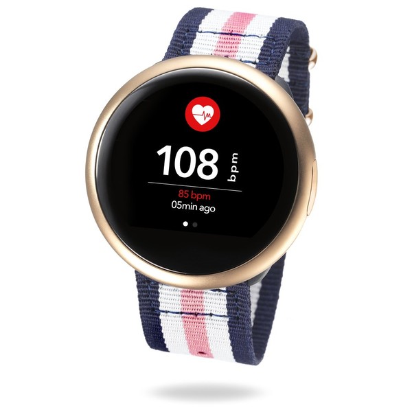 MyKronoz ZeRound2 HR Premium Smartwatch with Heart Rate Monitoring and Smart Notifications, Swiss Design, iOS and Android - Brushed Pink Gold/Pink White Blue NATO Band