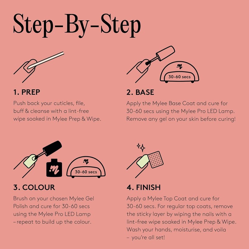 Get flawless gel manicures for up to 3 weeks; expect no chips, smudges, nicks or dents. Suitable for use on natural, acrylic or false nails and tips. Mylee is easy to apply and requires curing under UV or LED lamp.