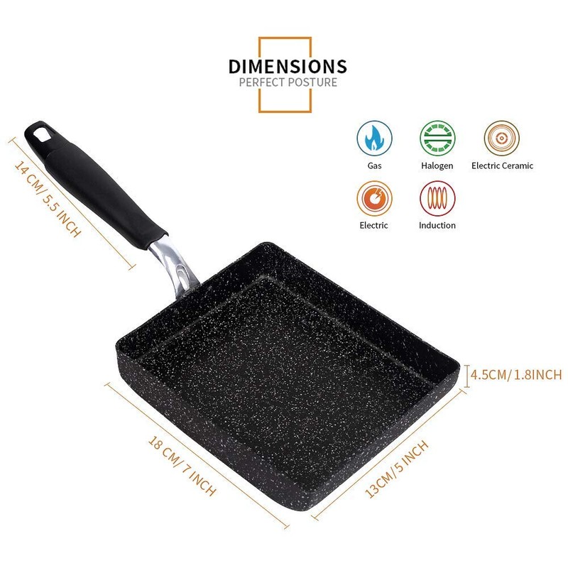 - Tamagoyaki Pan measures 5" W x 1.18" H x 7" L, handle length 5.5