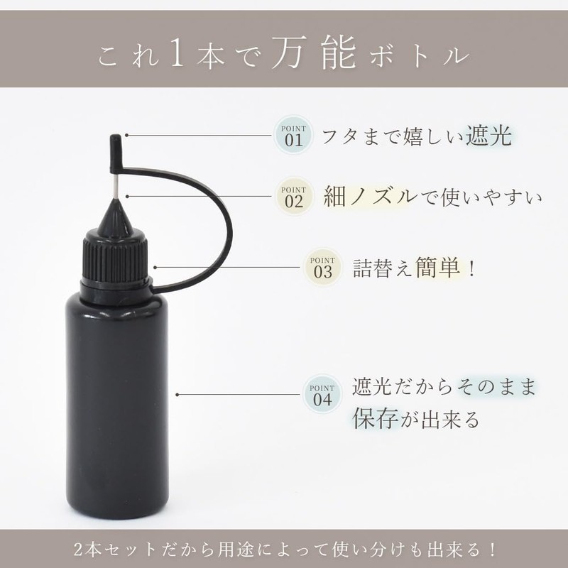 There are 2 containers so you can use them for a variety of purposes such as filling oil in shakashaka resin or resin that bonds decorative parts to the artwork. The black bottle is hard to let the light through, so you can refill it safely.