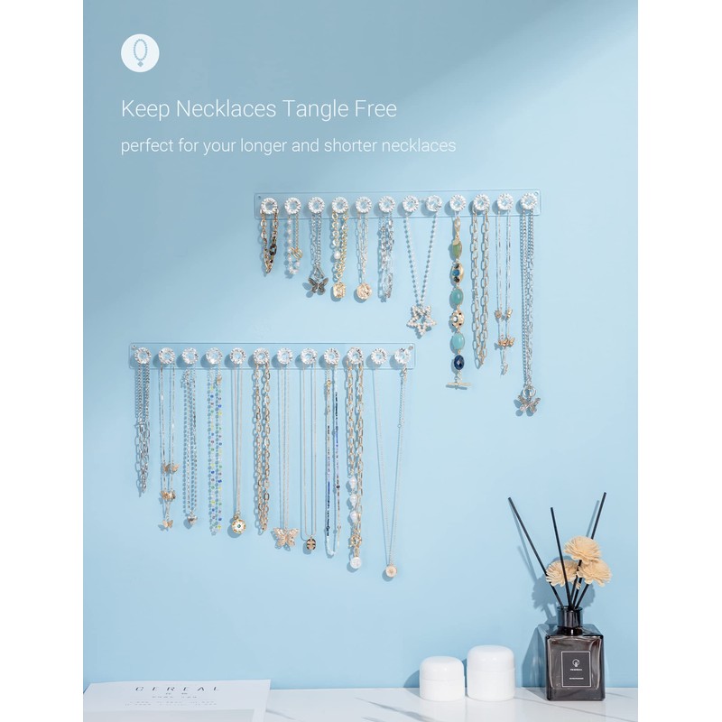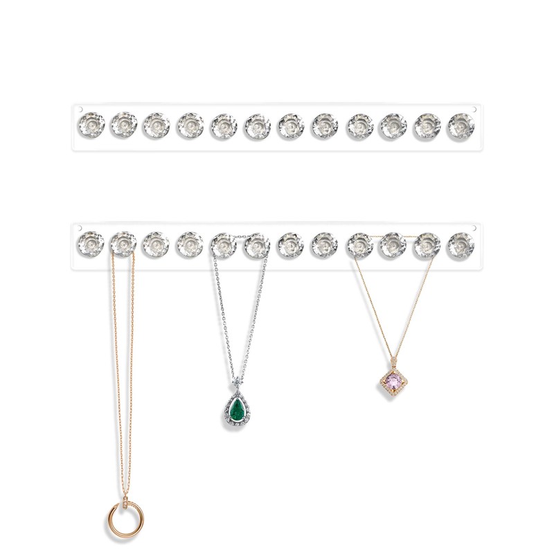 - 2-Pack. Overall dimensions are 13.4’’ long by 1.4’’ high. Each necklace holder has 12 individual knobs. All your necklaces or bracelets can be completely organized and easily accessible in a fairly compact area. No need to search for a particular item in a jumbled box or untangle a mass of chains anymore.
