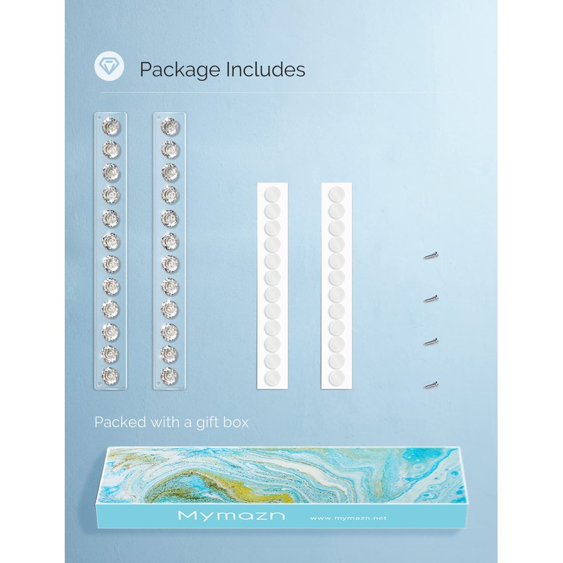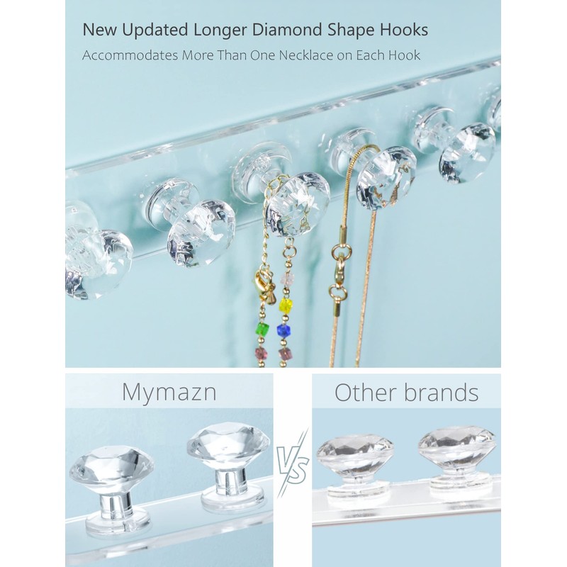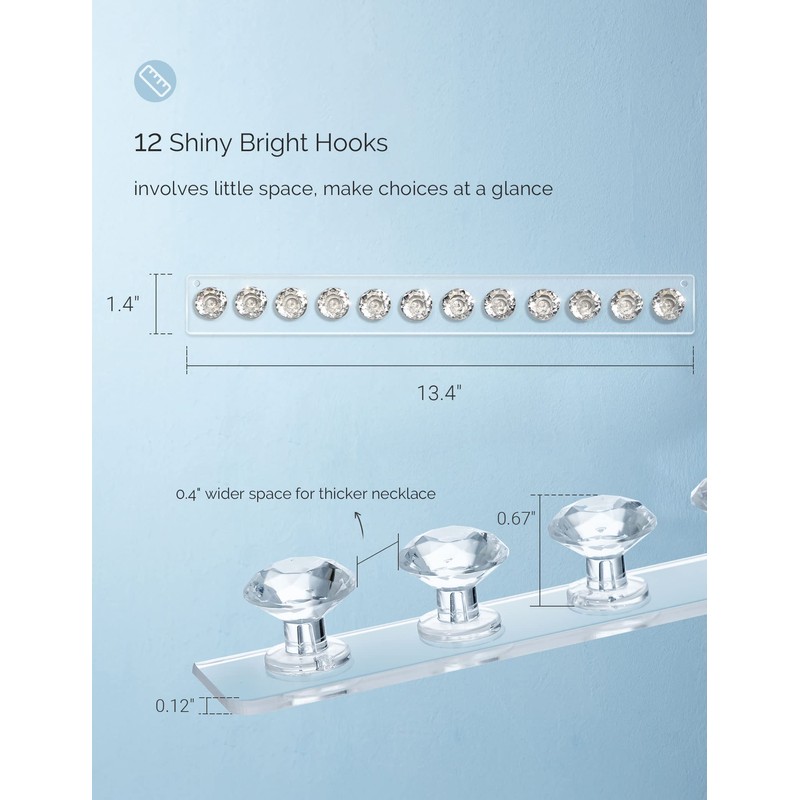 - Made of acrylic, this completely transparent design features shiny bright diamond shape hooks. This jewelry hanger enhances home décor well and adds glamorous elements to a bedroom or closet.