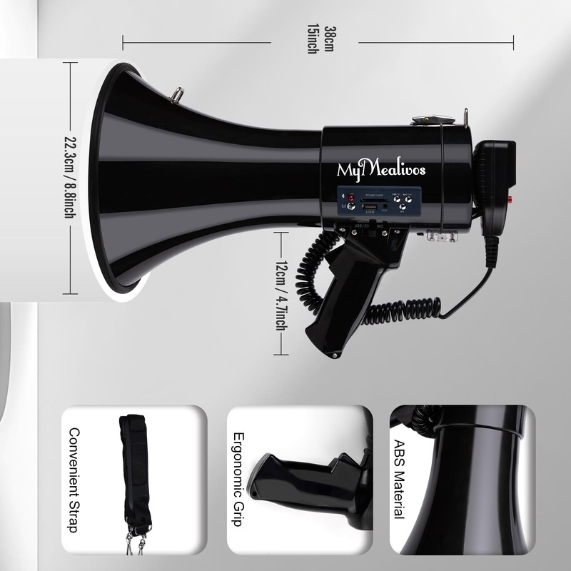 MyMealivos 50W Bluetooth Megaphone with Rechargeable Battery-Professional Bullhorn with Siren&240s Recording Supports USB/SD/3.5mm Aux-1600ft Range for Sports Police Emergency Outdoor Activities-Black