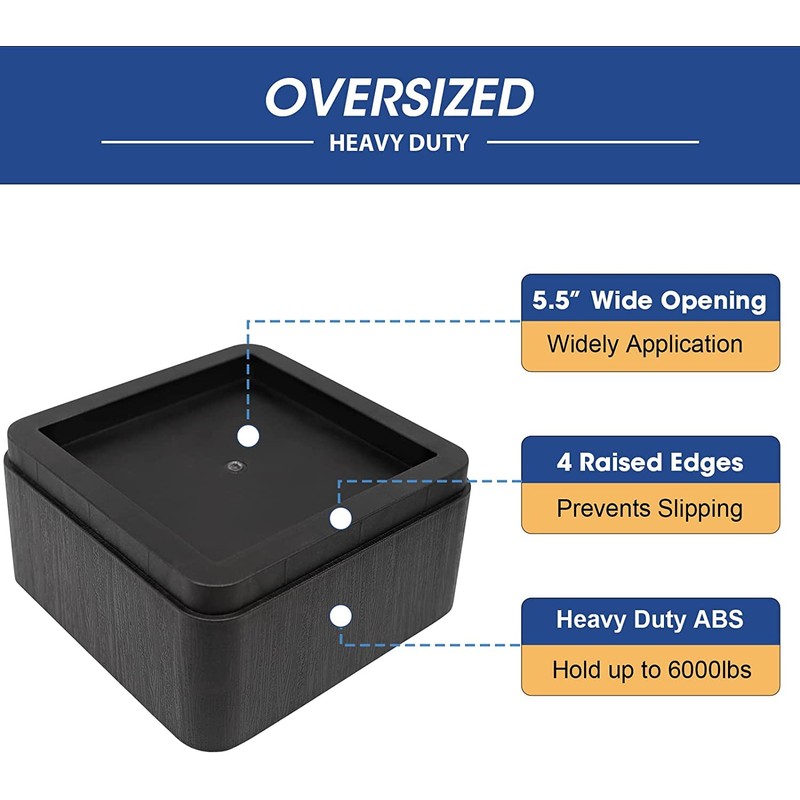 - 【Oversized Bed Risers】Each bed risers has a 5.5x 5.5 inch and 0.7depth top opening; this oversized featured makes bed risers fits for desks, chairs, sofas, caster wheel furniture, beds, and as couch risers
