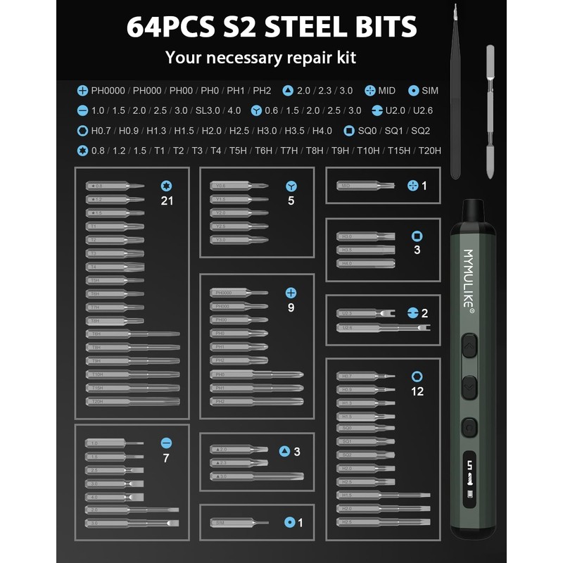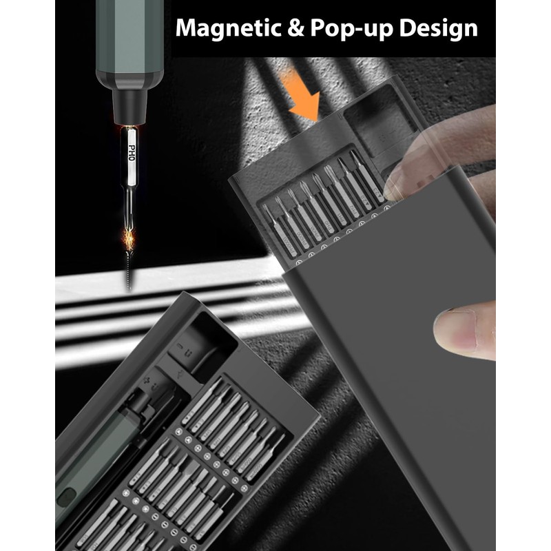 - 【Wide Application】Equipped 64 precision bits - Phillips, Torx, Flat Head, Triwing, Hex, Pentalobe, Triangle, etc. It features 16 long bits for complex deep-hole applications. The integrated magnetizer provides immediate magnetization for screwdriver tips. The Metal Spudger helps pry and poke, and the tweezers are ideal for working with micro electronics