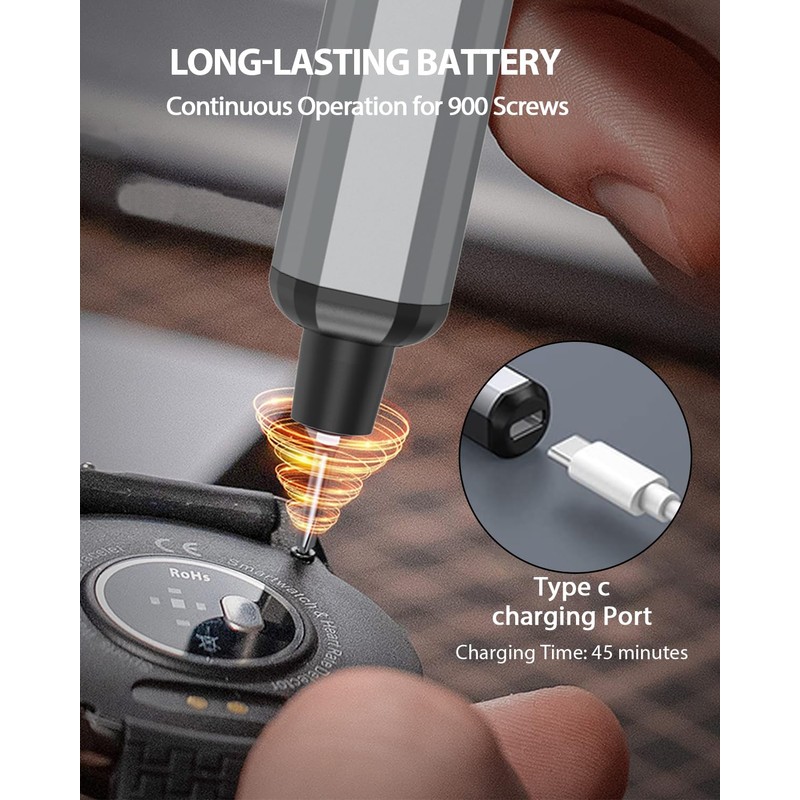 - 【POWERFUL CONTINUITY】The rechargeable lithium battery provides 350mAh power, supporting up to 1000 screws with a full 1 hour charging time. The screwdriver also features 4 built-in LED work lights for use in low-light environments.And no-load speed of 200 RPM, this electric mini screwdriver offers efficient fastening performance to save you time and effort