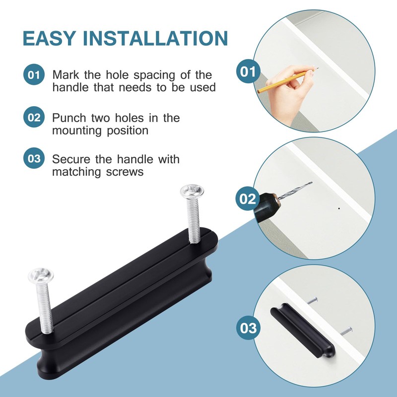 - Easy to install: Measure the centre of the actual hole to ensure successful installation (there may be an error of 1-2 mm). Mark the installation position on the cabinet door/drawer according to the actual hole center and drill the installation hole. Each modern drawer handle is equipped with two M4 x 22 mm screws, which are easy to install with a Phillips screwdriver.