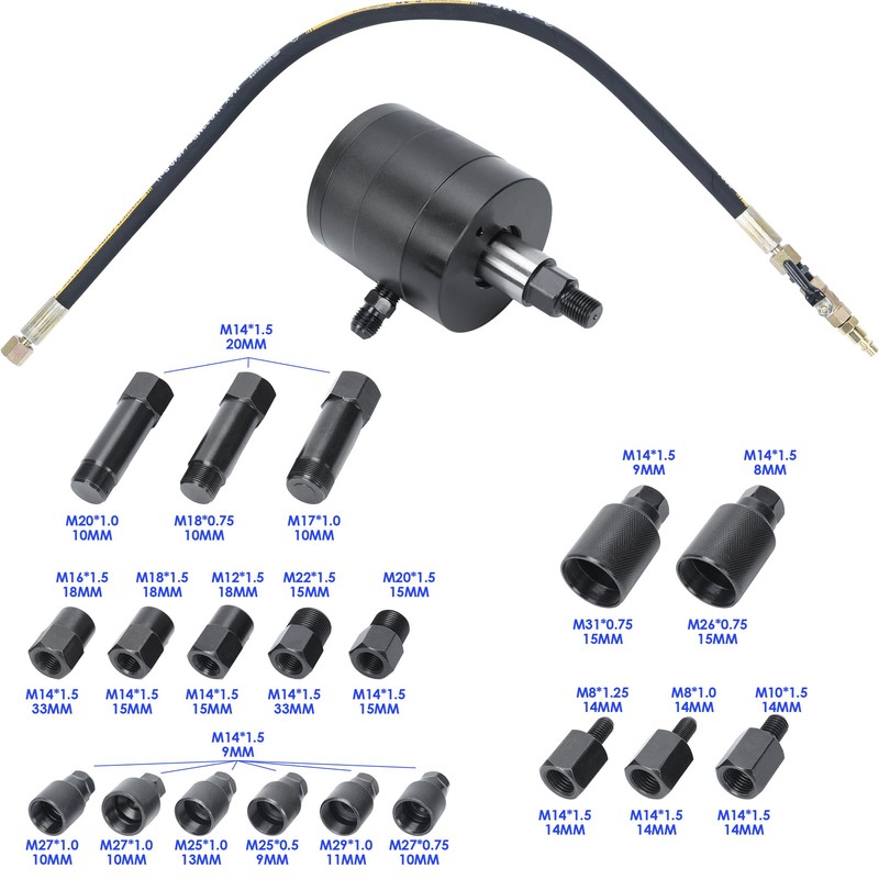 • Various Adapters: This diesel injector extractor master kit include M20×1.0, M18×0.75, M17×1.0, M8×1.25, M8×1.0, M14×1.5, M12×0.5, M10×1.5, M25×1.0, M27x0.75, M27x1.0, M29x10. The Pneumatic Injector Puller Diesel Injector Puller Kit offers extensive size support, covering a wide range of injector systems to meet the needs of various engine models