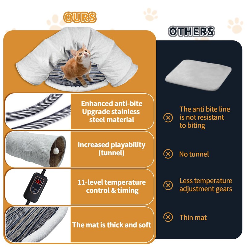 - Safety: Upgraded stainless steel anti bite wire, more resistant to biting and sturdy.Built-in intelligent temperature sensor in the pet heated mat to prevent overheating to protect pets.