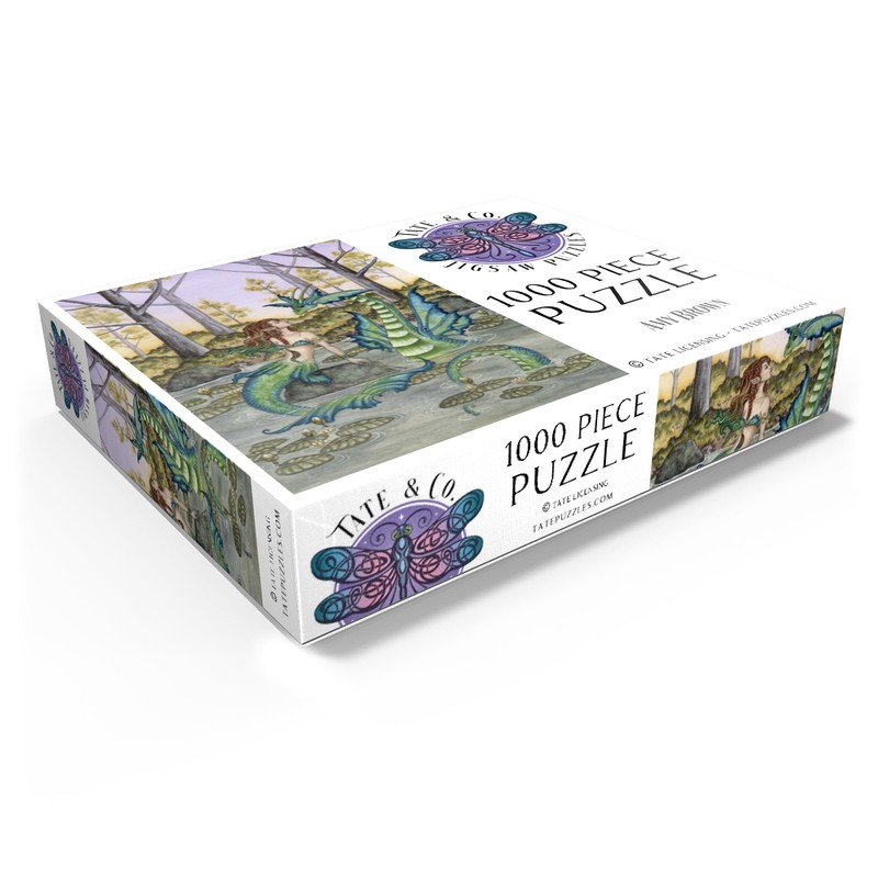 1000-piece Jigsaw Puzzle Lazy Afternoon Mermaid - Amy Brown from the Tate & Co Puzzles Collection by MyPuzzle. In Lazy Afternoon, a serene mermaid shares a quiet moment with a gentle sea dragon among lily pads and golden forest light. Their peaceful connection radiates a sense of calm magic, as if time itself has slowed in this enchanted woodland pond.
