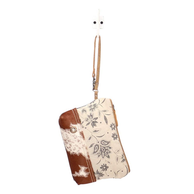 - {Lightweight Canvas Wristlet} The Myra Floret pouch is sized specifically for daily small essentials you carry. Featuring a light colored floral pattern combined with a brown and white genuine cowhide bottom, this on-the-go wristlet matches any outfit, perfect for everyday use