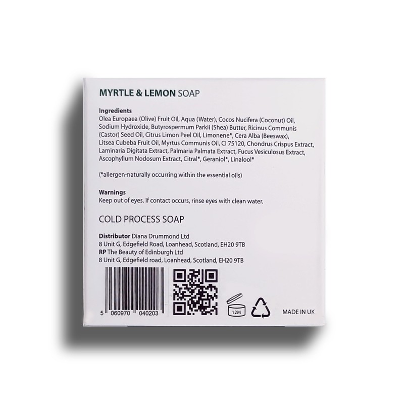 Branded by DIANA DRUMMOND Ltd A great favourite from our soap range, this Myrtle & Lemon Soap is made with infused Olive, Coconut and Castor oils using the traditional cold process and seaweed gel. Contains an infusion of wild harvested Myrtle (traditionally known as Sweet Gale - myrtus communis) lemon essential oil and is palm oil free. Myrtle is used in herbal medicine for its antibacterial properties.