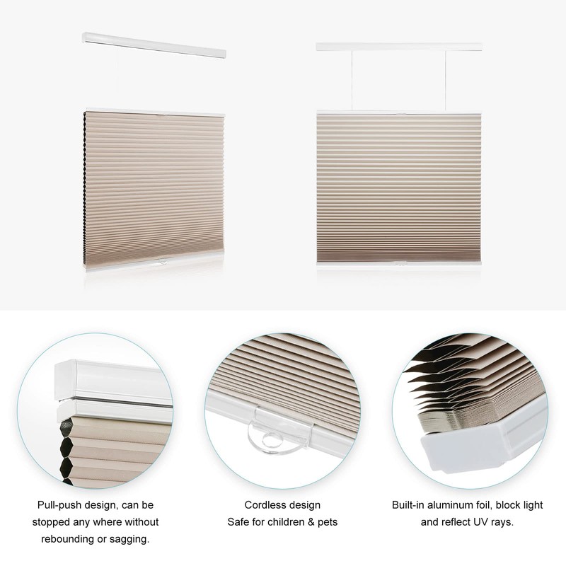 - Functional: Compared to ordinary honeycomb blinds, our blinds can be top-down/bottom-up, are more functional wireless blackout honeycomb blinds with a push-pull automatic locking system, allowing you to freely adjust the height of the blinds to enjoy the view outside while maintaining privacy.