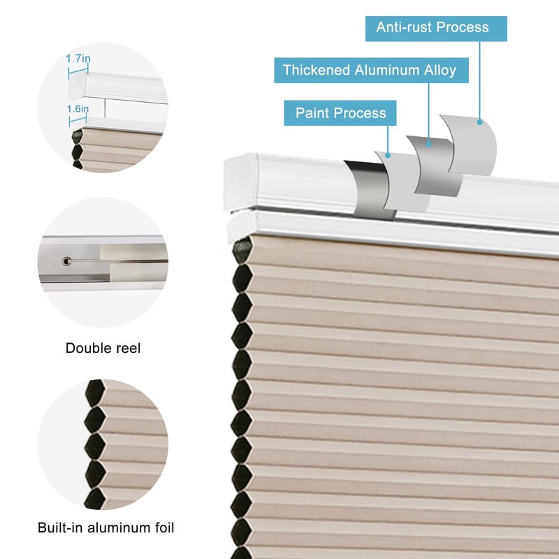 - High-quality fabric: Our blinds are made of environmentally friendly non-woven fabric that is soft to the touch. Ensuring environmentally friendly and non-hazardous, it is long-lasting and will not deform, effectively increasing its service life. The unique honeycomb structure with built-in eco-friendly aluminium foil coating provides insulation and sound absorption, insulates against harmful UV rays and effectively protects household items.