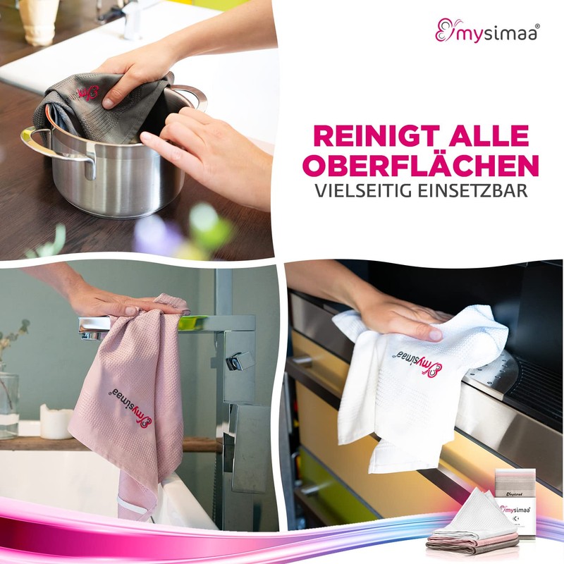 - OHNE CHEMIKALIEN : Befeuchten Sie mysimaa mit klarem Wasser (ohne Chemie), wringen Sie es bei Bedarf gut aus und bringen Sie Ihre Oberflächen in kürzester Zeit auf Hochglanz. Stainless steel or chrome - no problem for our cleaning cloth.
