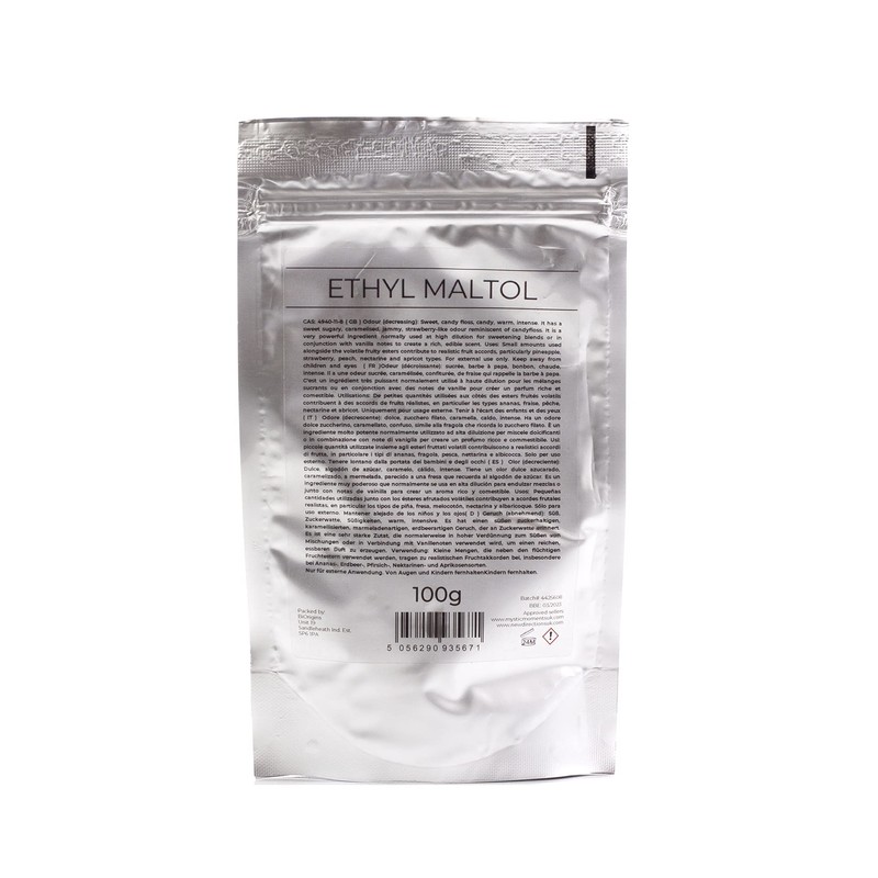 It has a sweet sugary, caramelized, marmy, strawberry-like smell reminiscent of cotton candy. It is a very powerful ingredient usually used at high dilution for sweetening mixtures or in conjunction with vanilla notes to produce a rich, edible fragrance.