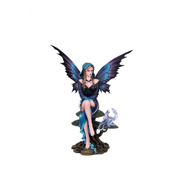 Mystical Fairy with Dragon Statue - Gothic Fantasy Figurine, Hand-Painted Resin Art Sculpture with Dark Blue Wings, 10 Inch Collector's Display for Home Decor