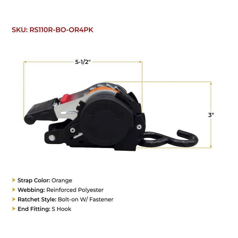 - Size & Capacity: These orange ratchet straps are available in size 1" x 10', with a 1" sized S-hook each. With a working load limit of 500 lbs and a breaking strength of 1,500 lbs, these straps can be used in motorcycles, bikes, boats, or anything else that needs to be transported. The package contains 4 ratchet straps with bolt-on fasteners, along with a poly bag which simplifies the storage of these straps.