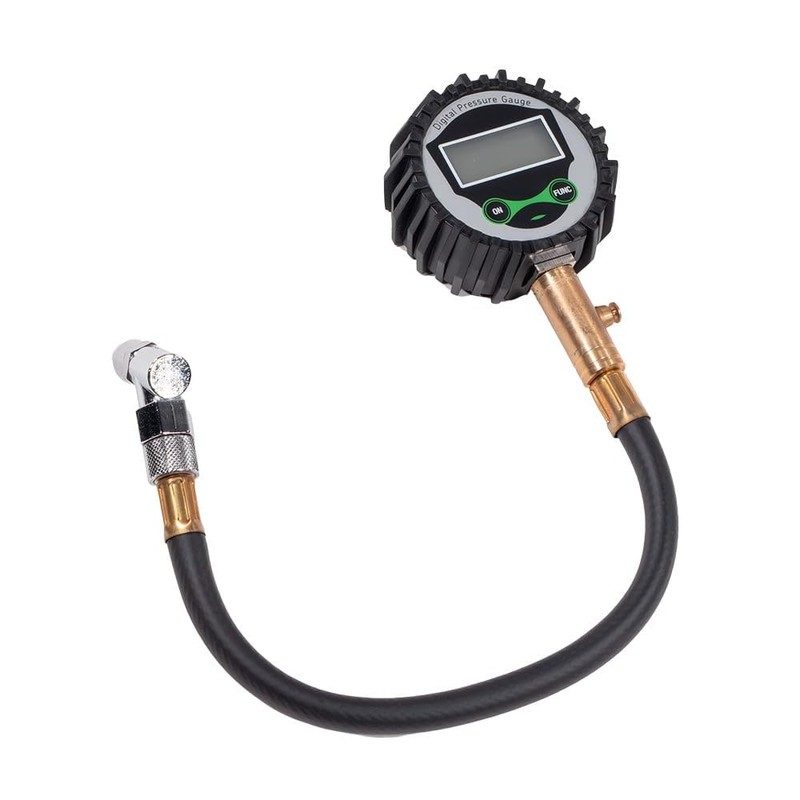 - The air pressure gauge features a high-resolution LCD with a battery life indicator (includes 2x AAA batteries). It will provide quick and accurate tire pressure, eliminating any guesswork. The LCD has a length and width of 3/4" x 1-1/2", respectively, whereas the protective guard has a diameter of 3".