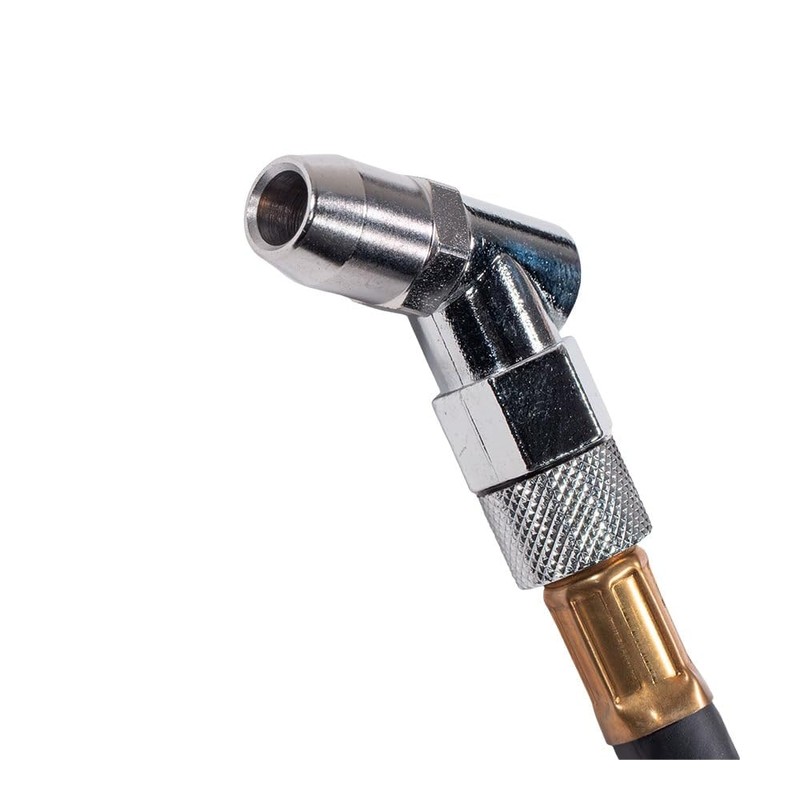 - The bottom metal connector includes a 360-degree swivel that connects the zinc alloy angled chuck and hose. The extended tip is 145 degrees bent to access the tire valve from any angle easily. You can swap this angled chuck with any 1/4" NPT chuck.