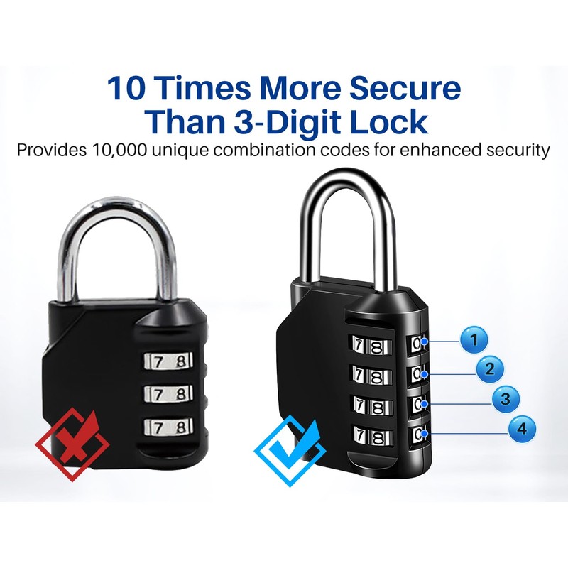 - Alta seguridad: el candado cuenta con 10000 códigos de combinación formados por números de 4 dígitos, lo que lo hace lo suficientemente seguro para un uso ligero. Con el candado Mythco, puede estar seguro de que sus pertenencias estarán protegidas.