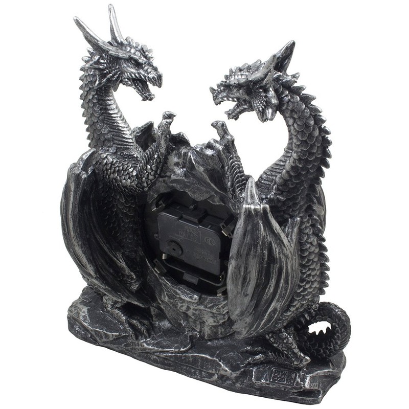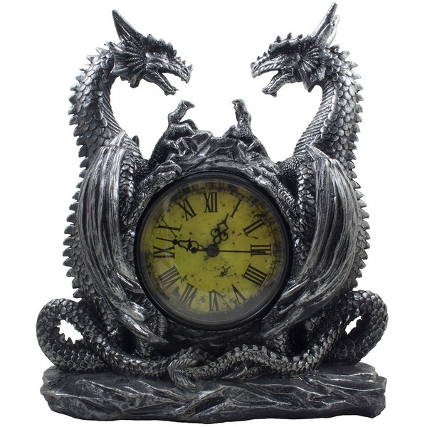 Mythical Dragon Duo Desk Clock in Metallic Look and Antique Face with Roman Numerals for Desktop, Shelf & Mantle As Gothic Medieval Decor Or Decorative Office Gifts