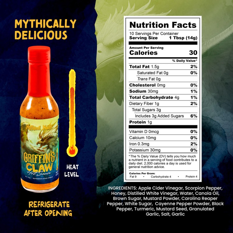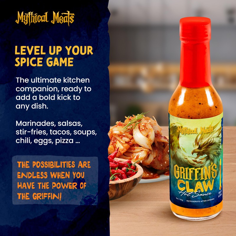 - UNLEASH THE GRIFFIN'S FURY: Griffin's Claw Hot Sauce is a fierce fusion of scorpion pepper's searing heat and the tangy, sweet notes of honey mustard. With an impressive 8/10 heat level, this sauce packs a powerful punch while offering a delightful balance of flavors. The scorpion pepper's intense fire is tamed by the honey mustard's sweetness, resulting in a truly balanced taste experience.