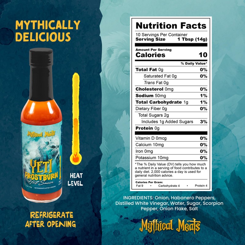 Embark on a frosty flavor journey with our Mythical Creatures Hot Sauce collection, where each sauce is inspired by legendary beings. Conquer the Yeti's Frostburn, a delightful fusion of sweet onion and the zesty punch of habanero peppers. With a moderate 5/10 heat level, this sauce provides a gentle warmth, perfect for those who enjoy a milder spice experience. The mellow sweetness of onion pairs beautifully with the bright, citrusy notes of habanero, creating a refreshing and balanced flavor that's both unique and satisfying. Our sauces are crafted to offer Legendary Taste with Modern Nutrition. Gluten-free, non-GMO, and low in sugar and carbs, so you can enjoy bold flavors without compromising your health goals. Elevate Your Cooking Game with these versatile sauces, which are ideal for enhancing grilled meats, stir-fries, pizzas, and more. Perfect for Spice Enthusiasts, our sauces make extraordinary gifts for those who appreciate mythical lore and unforgettable flavors. Proudly Made in the USA, every bottle is filled with the finest natural ingredients, capturing purity and authenticity that befits a legend. The perfect ingredient to spice up fish, pork, chicken, beef, game meats, BBQs, salads, risottos, fast food, beans, ramen, tacos, burritos, shrimp, quesadillas, vegetables, wings, eggs, pasta, stir fries, rice, chili, sandwiches, burgers, hotdogs, and everything else under the sun.