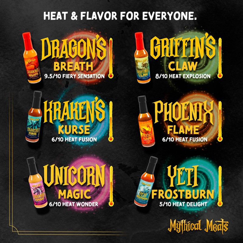 • CRAFTED WITH INTEGRITY IN THE USA: Mythical Meats' hot sauce line is proudly made in the USA, using only the finest natural ingredients. We've scoured the land for the most peppers, spices, and seasonings to create flavors that are as authentic as the legends themselves. Free from artificial colors and flavors, our sauces are a testament to the purity of mythical excellence.