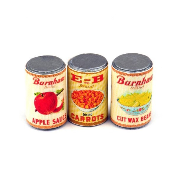 MyTinyWorld Set Of 3 Dolls House Miniature Burnams Brand Cans (1930s)