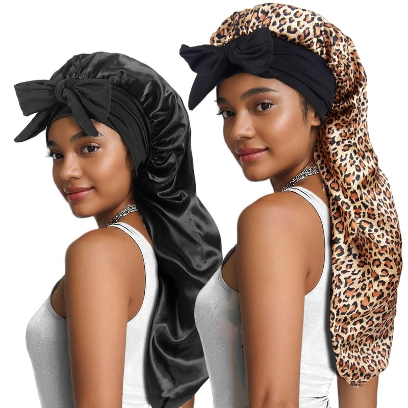 MYTOAU 2pcs Long Satin Bonnets with Tie Band, Large Braid Bonnet Silky Hair Cap for Locs Women Sleeping Double Layer Adjustable Bonnets for Black Women Curly Hair Cap(Black Leopard)