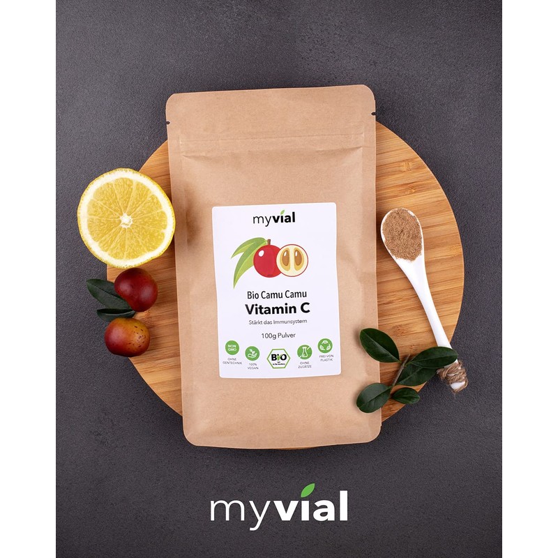 myvial® Organic Camu Camu Powder 100 g - Vitamin C (Ascorbic Acid) for Immune System and Defences - Dietary Supplement Vegan without Additives Plastic-Free Packaging