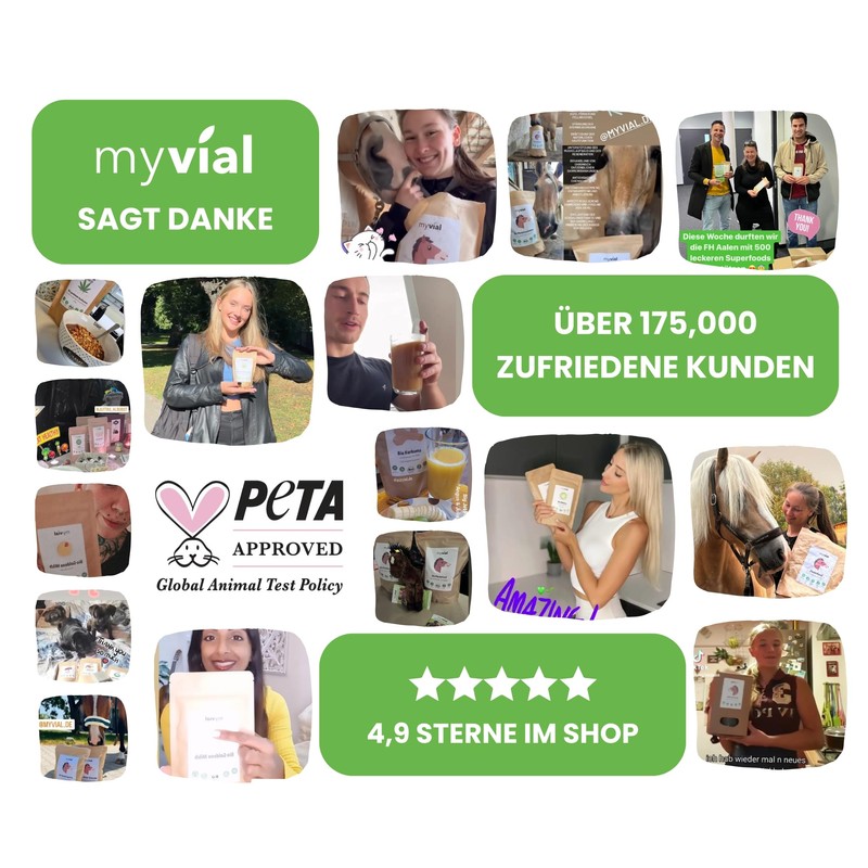 - Satisfaction promise – you as a happy customer are the focus of our attention. Our products are subject to strict quality requirements and are checked several times during production by trained specialists. If a myvial product does not meet your expectations, we will do everything to find a common solution. Because only if you are happy, we at myvial are also