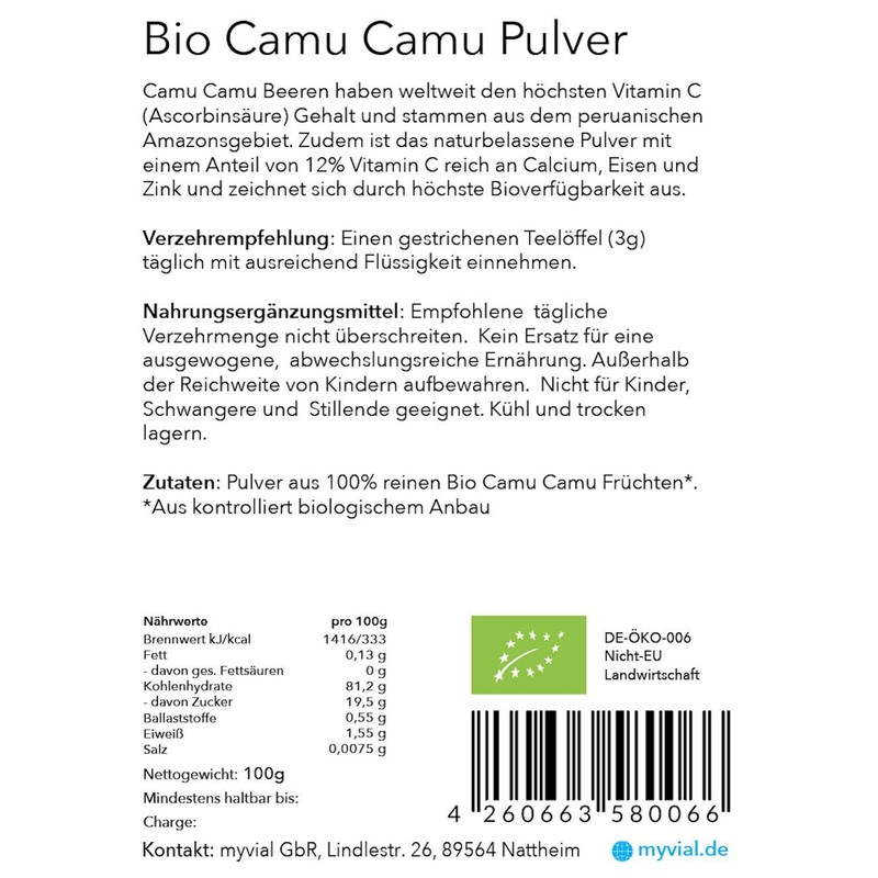 - Natural organic – our organic camu camu powder with a high vitamin C content is made from 100% natural powder without any additives in certified organic quality.