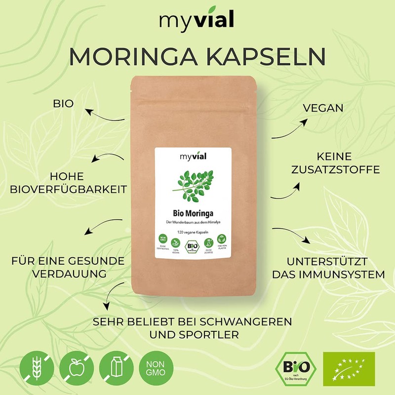 - Excellent value for money – a daily dose corresponds to 3 organic Moringa capsules, this contains 1200 mg ground organic moringa leaf powder from India. The plastic-free packaging contains 120 vegan capsules (kosher and halal), which provides you with 40 days.